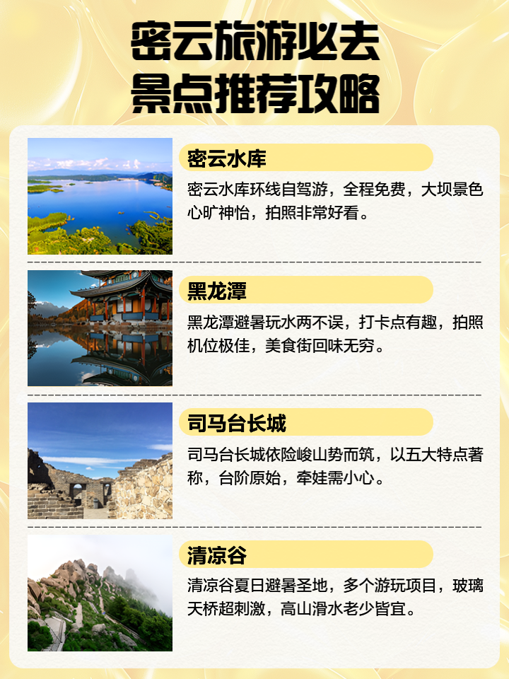 就是密云的十大旅游景點(diǎn),每個(gè)景點(diǎn)都擁有獨(dú)特的自然風(fēng)光和豐富的文化遺產(chǎn),為游客提供了一次難忘的旅游體驗(yàn),無(wú)論是探索自然風(fēng)光還是感受文化氛圍,密云的這些景點(diǎn)都能滿足您的需求,歡迎您來(lái)到這片美麗的土地,探索自然與文化的完美結(jié)合。