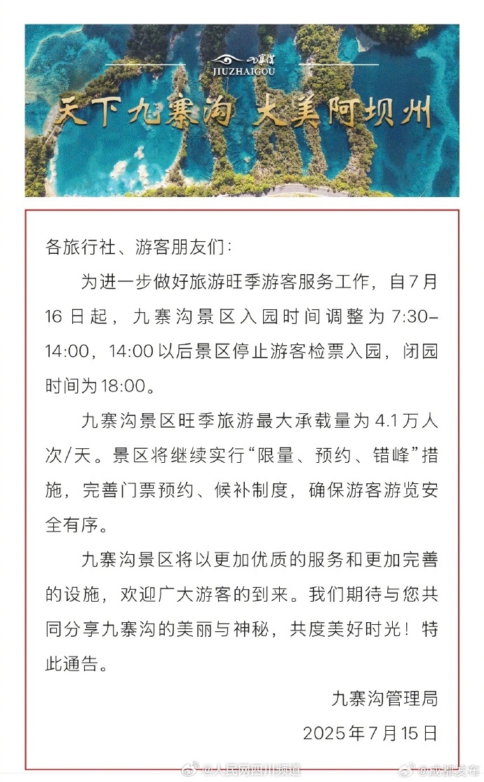 轉(zhuǎn)載請注明來自濰坊公路發(fā)展集團有限公司,本文標題:《九寨溝開放時間最新消息,全面解讀最新開放計劃,九寨溝最新開放計劃全面解讀,開放時間更新消息》